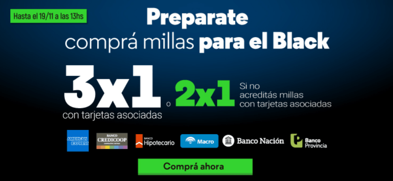 Y quienes tengan asociada a la cuenta, una tarjeta de crédito Aerolíneas Plus emitida por las entidades asociadas al programa, te triplicamos las Millas compradas.