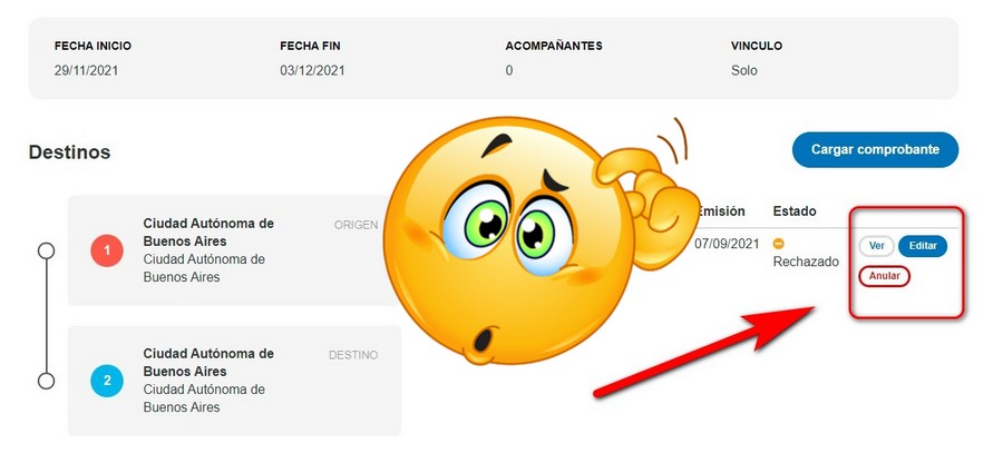 Una vez dentro del viaje, verás los comprobantes rechazados con tres opciones: