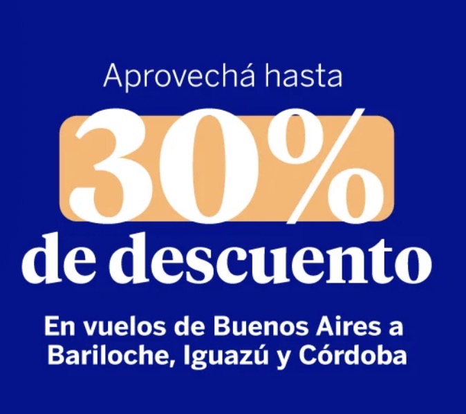 El programa de millas BBVA tiene vigente hasta el 27 de marzo, una muy linda promo por la que podrás conseguir 30% de descuento en la emisión de vuelos a Bariloche, Córdoba e Iguazú, sin tope y sin importar la fecha de viaje, en cualquier aerolínea